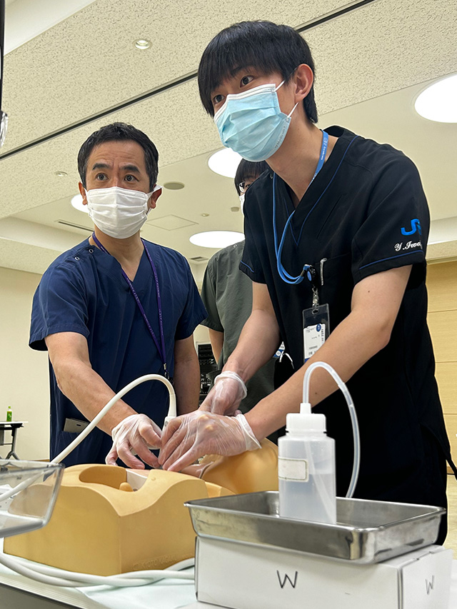 内科は24週以上、外科・小児科・産婦人科・精神科・地域医療はそれぞれ4週以上の研修を必修とする。内科は当院の6診療科(呼吸器内科、循環器内科、消化器内科、血液内科、糖尿病・代謝内科、脳神経内科)から希望の科を選択し基本4週ないし8週ずつ研修する。小児科は協力医療機関である松下記念病院で4週、産婦人科は当院と大阪医科薬科大学病院で2週ずつ、精神科は当院とさやま病院/阪南病院で2週ずつ研修する。地域医療研修は2年次に行い、地域ケア病棟・医療療養病棟を持つベルピアノ病院で2週、近隣の医療機関で1週、へき地の医療機関で1週研修する。